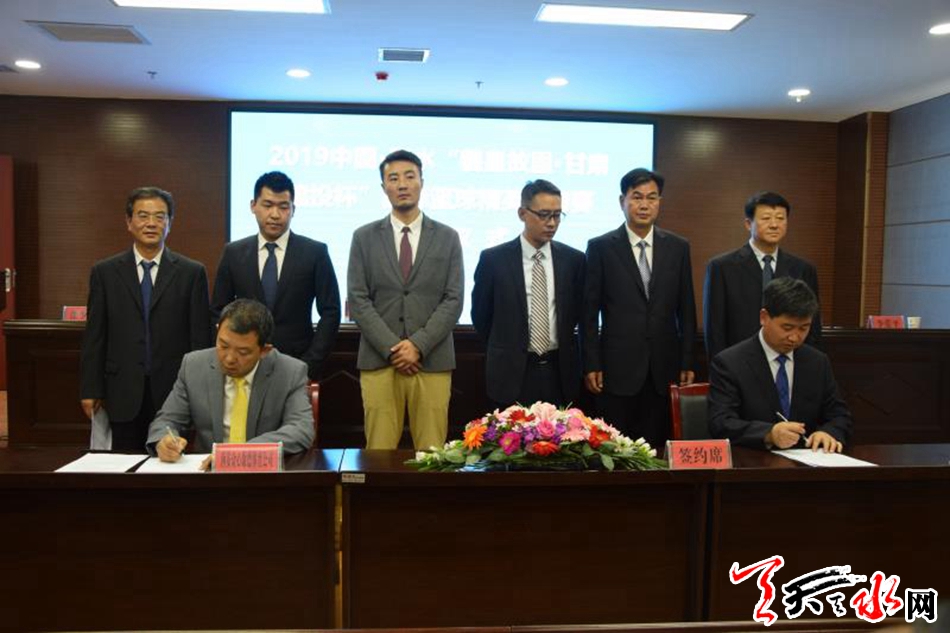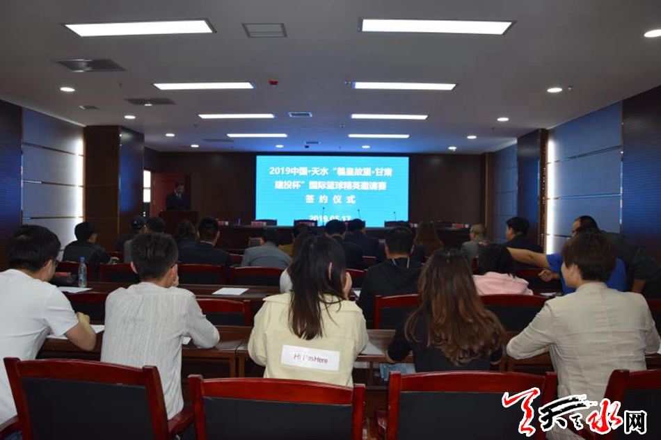天天天水网讯(全媒体记者 李欣桐)5月17日下午,2019中国•天水“羲皇故里•甘肃建投杯”国际篮球精英邀请赛冠名赞助签约仪式在政务大厅会议室举行。甘肃省篮球运动协会秘书长张建军,甘肃建投天水建设管理有限公司总经理张丰川,西安众心康德体育发展有限公司总裁李晨曦、总经理郭威,西班牙职业明星队中方代表郑博龙出席签约仪式。