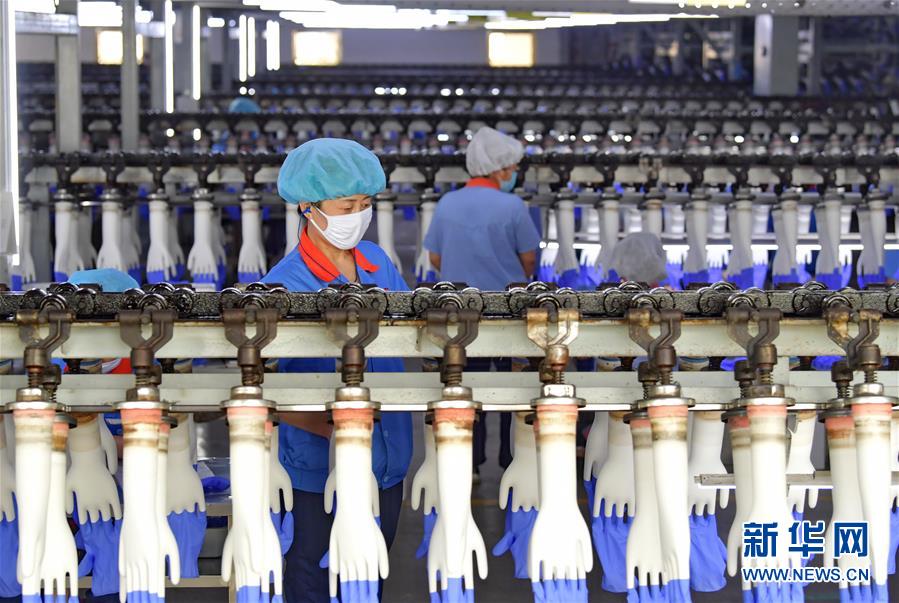 工人在河北省滦南县一家医疗用品企业的手套生产线上工作(5月14日摄)。新华社记者 杨世尧 摄