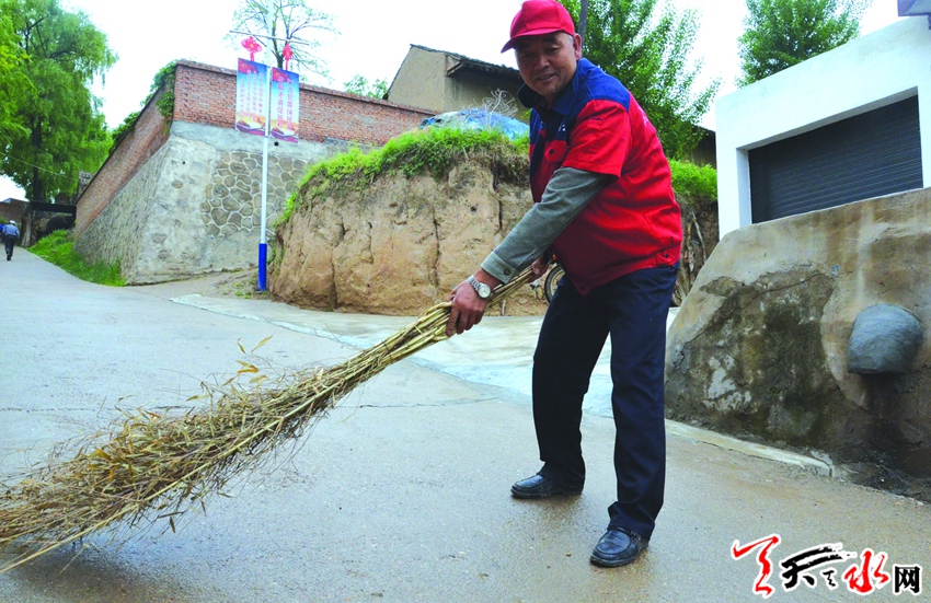 下过雨的张家川县胡川镇夏堡村空气带着清新湿润的泥土味,地里的庄稼和路旁的小草也被雨水冲刷得青翠嫩绿,由于早上风雨较大,延伸至每户每家的水泥村道上落下了树叶和杂物,马正明像往常一样穿上工作服,拿起配发的簸箕和扫把,开始清扫村里的道路。