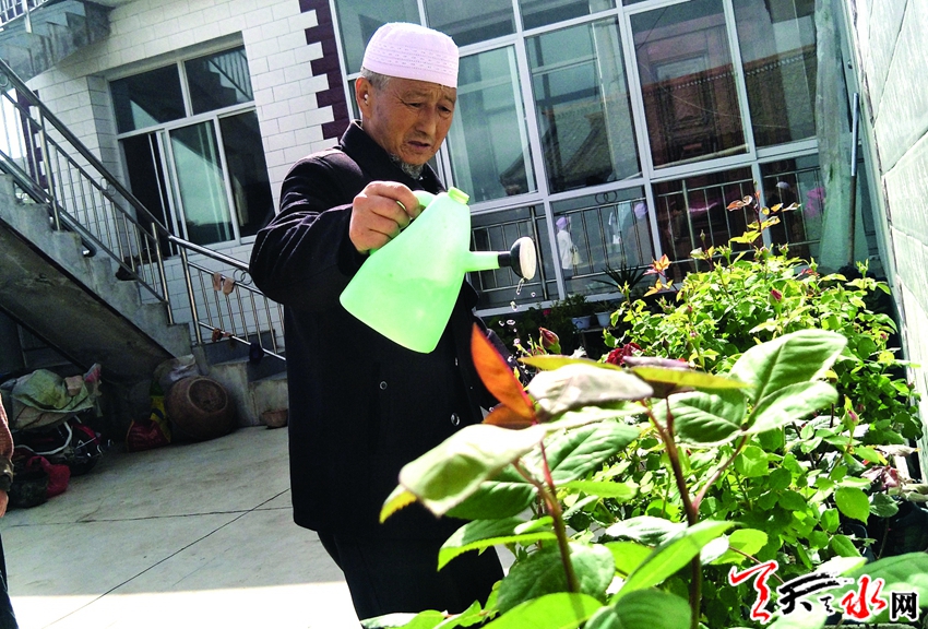 5月17日,记者走进李清义家院子看到,新盖起来的房子宽敞大气、窗明几净,水泥院里物件摆放整齐,一盆盆月季花含苞待放,今年68岁的李清义正在给花浇水。