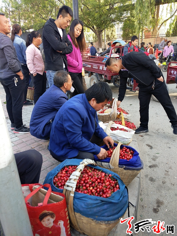 “这是南河川山地的樱桃,已经12元。”“来尝尝,这是瓦窑坡北山上的樱桃,真格甜,已经10元。”不论在七里墩市场,罗玉小区市场,还是绿色市场、花鸟市场,总会见到挑着竹筐,提着塑料桶叫卖果农。在各个市场,由于品质的不同,秦州樱桃的零售价也各不相同,在北园子市场西口,一大早就聚集了十几个卖秦州樱桃的商贩,一颗颗殷红光亮的樱桃堆在竹筐里,如同一座小山,一位中年妇女忙不迭的一边招呼生意,一边给围观的人介绍说:“这是瓦窑坡北山上的樱桃,品种叫美早,是早熟品种,今年雨水好,天气好,比往年早熟了几天,今早一早折的,色度好,甜的很,一斤12元,能一次要5斤,就一斤10元。”几个吃完早点的大妈尝过之后,每人以11元的价格买了二斤。 一家快递公司也已经在次拉起了横幅,一位员工说,现在本地樱桃下来了,大家都会给在远方的亲人朋友寄一些尝尝鲜,所以最近一段时间,樱桃成了各个快递公司的主要业务,大家都在挣客户,我们也把服务的触角延伸到了各个市场,市民买好樱桃,转身就能发单,即方便的客户,也增加了我们的业务量。
