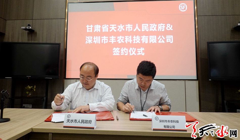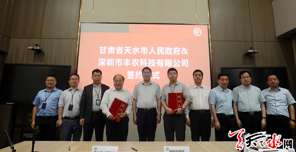 市委常委、副市长宫辉代表天水市人民政府与顺丰集团深圳市丰农科技有限公司签订现代农业全产业链合作框架协议。