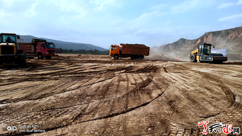 5月21日,记者在甘谷县新兴镇永安村看到,选址该村建设的甘谷土桥子脊兽产业园正在夏日的骄阳下如火如荼施工,大型运输车辆穿行在宽阔平坦的施工场地正在回填土方,一派快马加鞭的忙碌的景象。