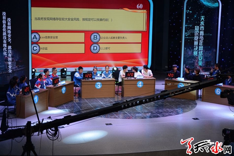 天天天水网讯【全媒体记者马哲 见习记者罗馨】5月28日下午,天水市青少年网络安全知识竞赛决赛在天水广播电视台演播大厅举行。清水县、天水师院、团市委、麦积区、甘谷县、秦安县等6支代表队的选手们就《网络安全法》及相关政策法规、网络安全基础知识、个人信息保护、网络安全防护技能等方面内容,以小组必答题、抢答题、风险题的形式进行激烈竞答。最终天水师院代表队获一等奖,团市委、清水县代表队获二等奖,麦积区、甘谷县、秦安县获三等奖。市人大常委会副主任蒲朝晖、市政协副主席王振宇分别给获奖代表队颁奖。