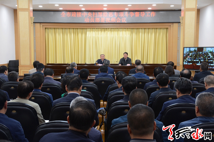 天天天水网讯【全媒体记者冯丽娟】5月29日,我市召开迎接中央扫黑除恶专项斗争督导工作动员部署视频会议,市委书记、市扫黑除恶专项斗争领导小组组长王锐出席会议并讲话。他强调,各级各部门要认真贯彻落实习近平总书记关于扫黑除恶专项斗争重要指示精神和党中央决策部署,进一步统一思想、提高认识,压实责任、强化措施,以中央督导为契机,推动全市扫黑除恶专项斗争向纵深发展。