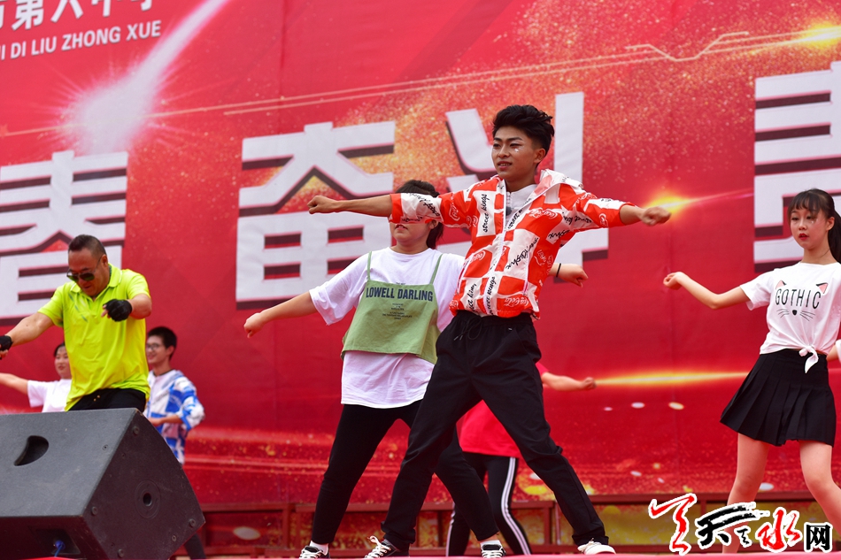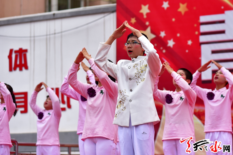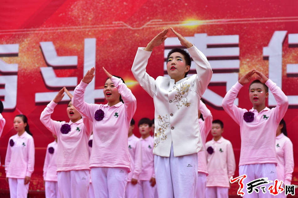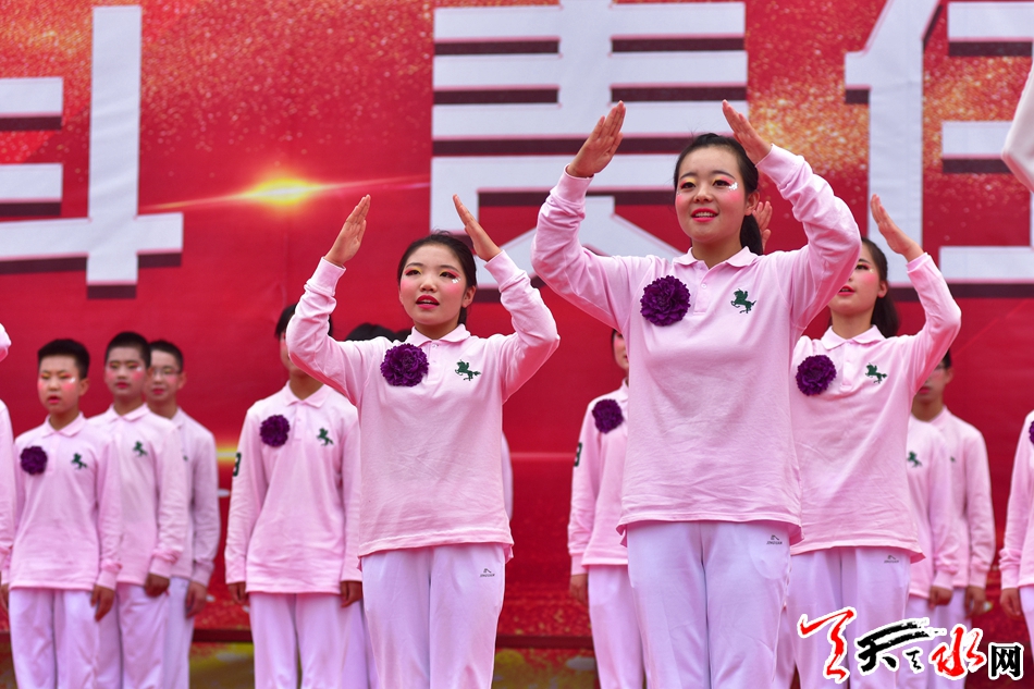 5月30日,天水市六中八年级一班的学生正在表演合唱《国家》。当日,该校校园艺术节开幕。艺术节上,同学们自编自演的各具特色的二十多个节目,集中展示了丰富多彩的校园生活和学校师生的积极向上的精神风貌。 全媒体记者 周文涛 摄