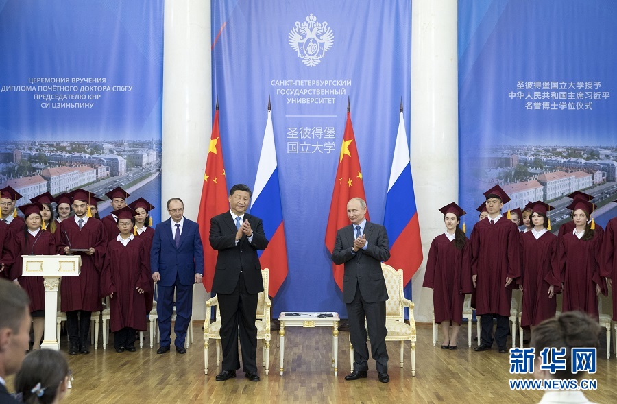 6月6日,国家主席习近平在圣彼得堡出席接受圣彼得堡国立大学名誉博士学位仪式。俄罗斯总统普京出席仪式。 新华社记者 王晔 摄