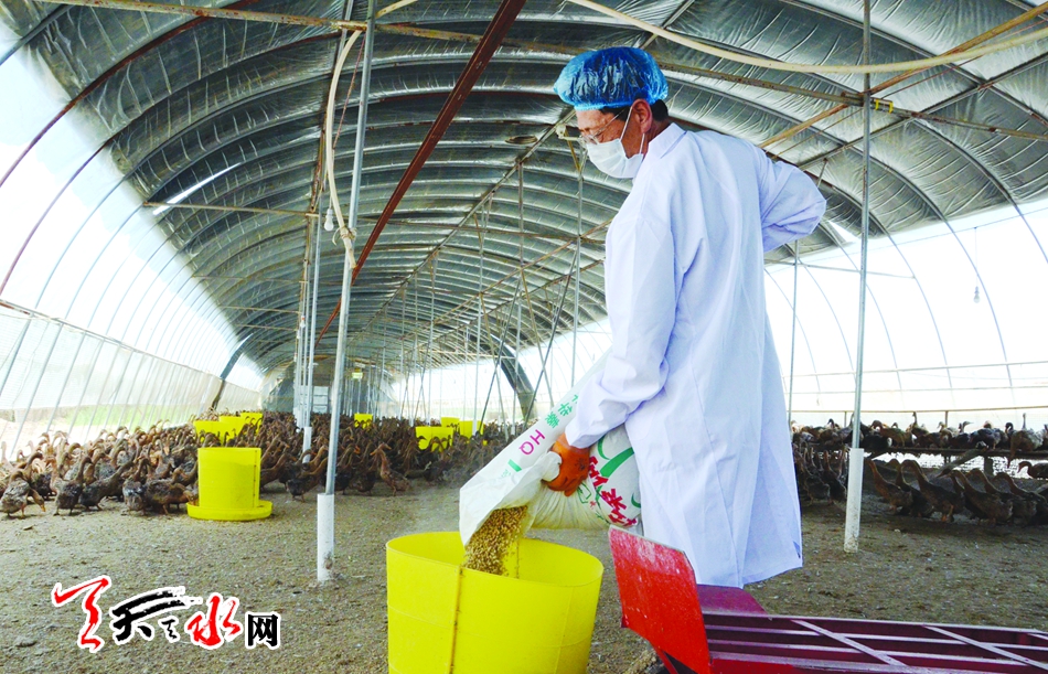 6月13日中午13时许,室外烈日炎炎,而位于秦安县中山镇中山村的蛋鸭养殖基地里,7万余羽鸭子在通风敞亮的鸭舍里悠闲地吃食、喝水、散步。53岁的饲养员李进忠正在养殖基地1号棚里观察鸭子的饮水情况。李进忠曾是秦安县中山镇中山村的建档立卡贫困户,以前一直在兰州打工,但这几年因为家中年迈的母亲需要人照顾,无法外出打工,就一直在家务农,日子过得紧紧巴巴。去年12月,他和妻子一起进入蛋鸭养殖基地工作,负责饲养12300余羽鸭子。