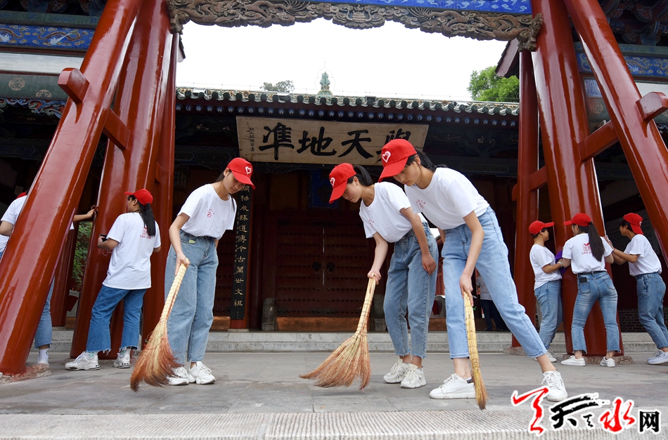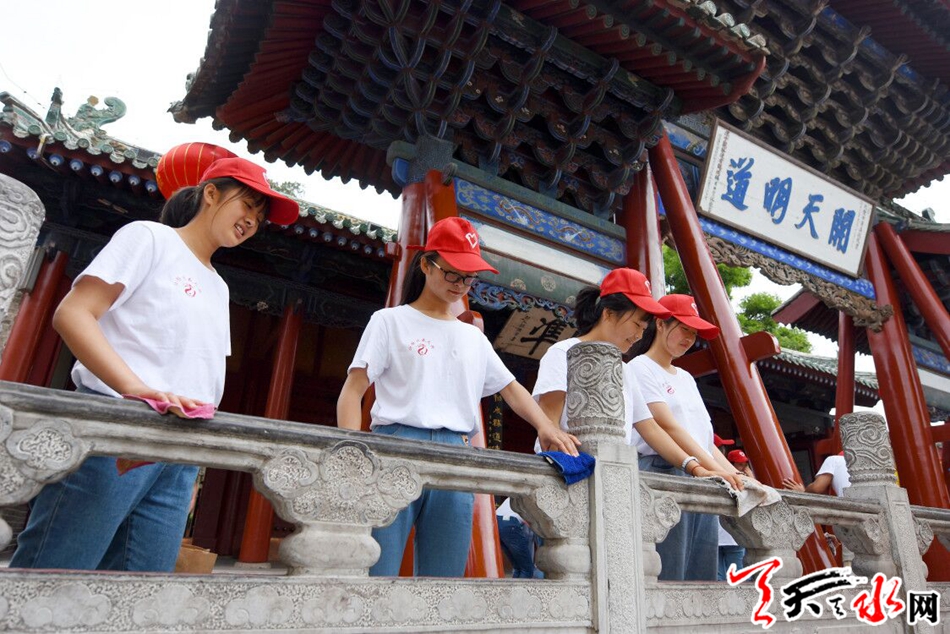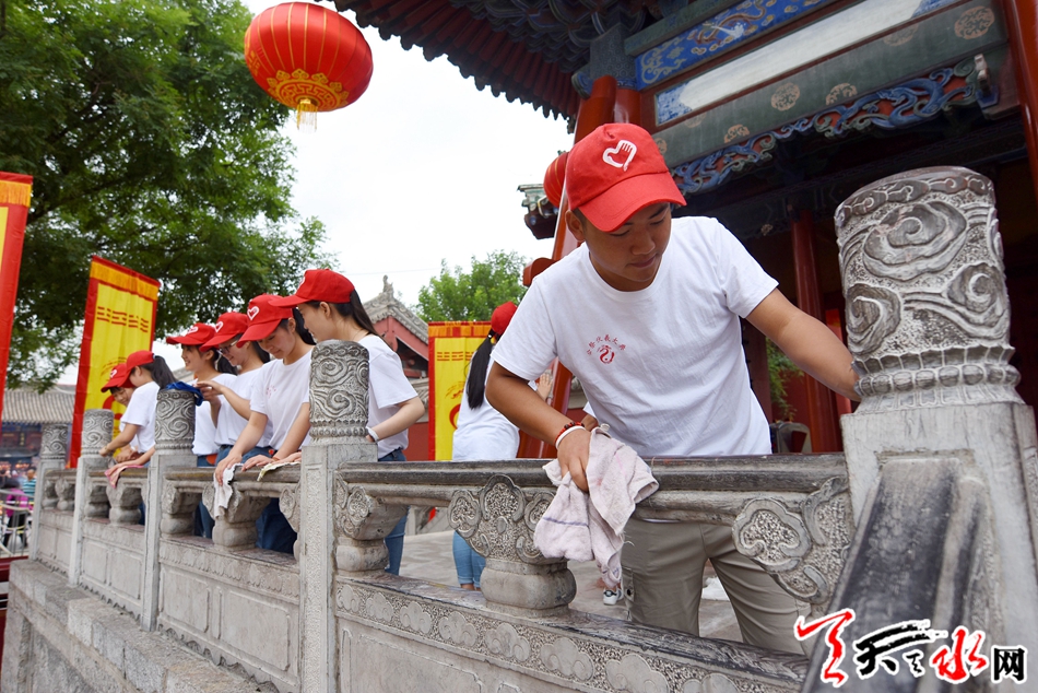 由甘肃工业职业技术学院、天水市职业技术学院组成的两支志愿者服务队共200名青年志愿者进行了现场签名承诺活动。之后,志愿者们对伏羲城东西牌坊、廊庭、墙面进行了彻底清扫。