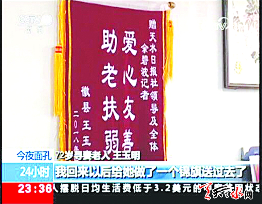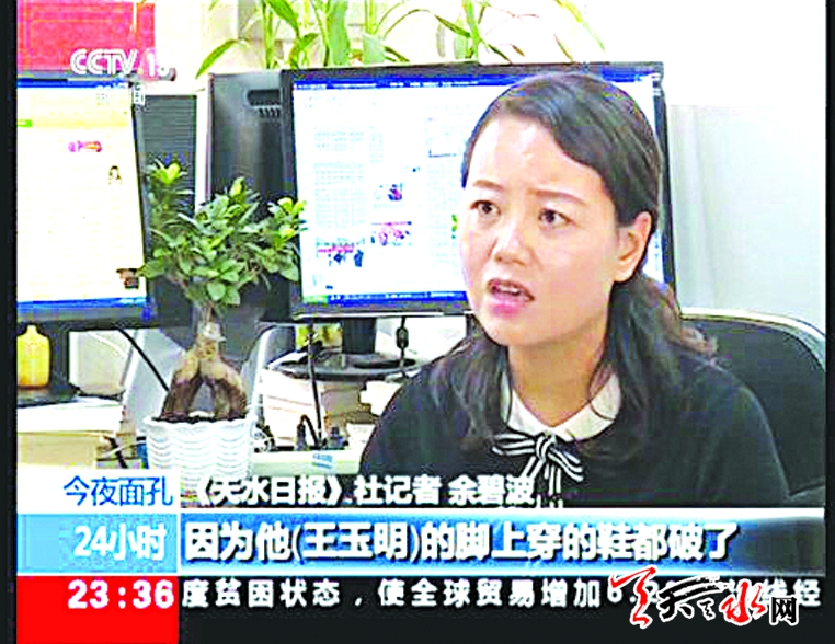 天水日报刊发了几篇新闻稿件,做了自己份内的工作,却受到王玉明老人的充分肯定,送来了一面锦旗。在接受央视采访时,老人一直说,天水日报社记者余碧波对他帮助很大,一定要采访她。老人还说:“天水日报的领导尊重群众,把我的心里话登上了报纸。报社职工很热心,纷纷给我献爱心,摄影部主任年葆东在他的微信公众平台上转发了文章,读者也给我捐了钱,一共4700元,给了我很大的安慰。余碧波详细了解情况,写了文章,给我买了一双鞋,硬塞了200元钱。有大家的帮助,我才能坚持下来。”