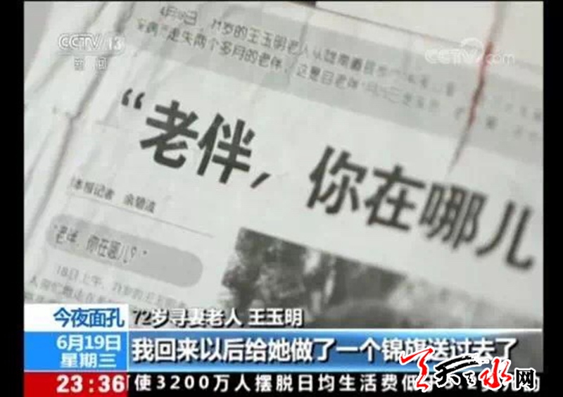 天水日报最先报道的《老伴,你在哪儿?》稿件一直受到社会关注,且在持续升温。四川、河南、山东、河北等地的读者、网友,传播信息,帮助寻找,许多新闻媒体转发消息,做了大量延展传播。6月19日,中央电视台新闻频道23点《24小时》栏目播出《王玉明:余生只为找到你》,用长达10分钟的时间,对王玉明老人寻找老伴的事迹作了深入报道,也对最先刊发报道的天水日报记者余碧波进行了专程采访。