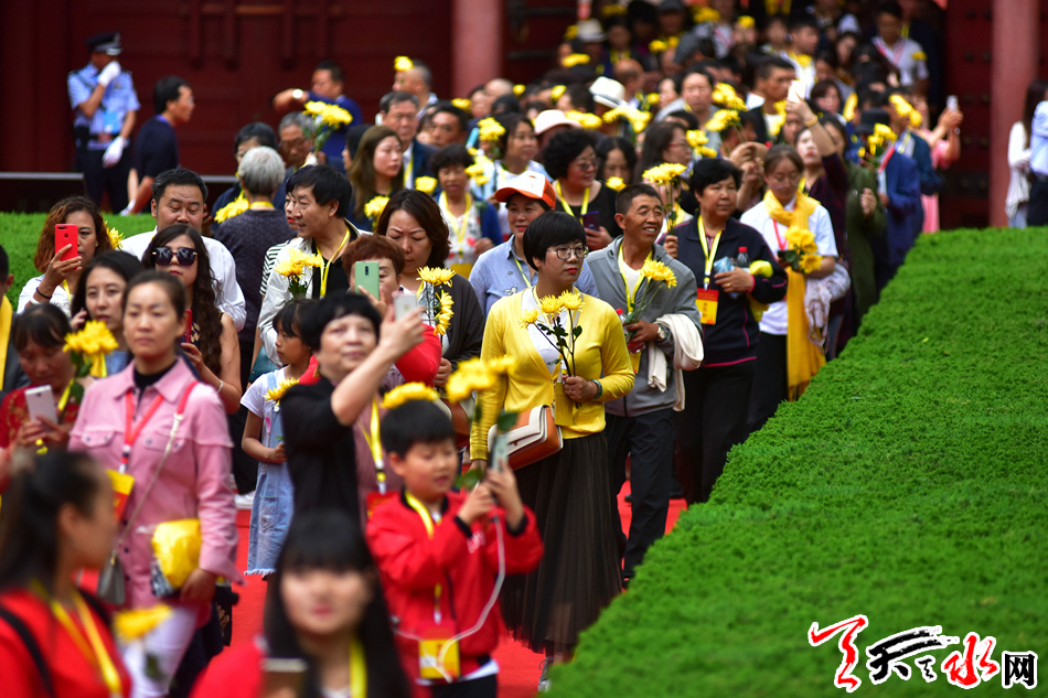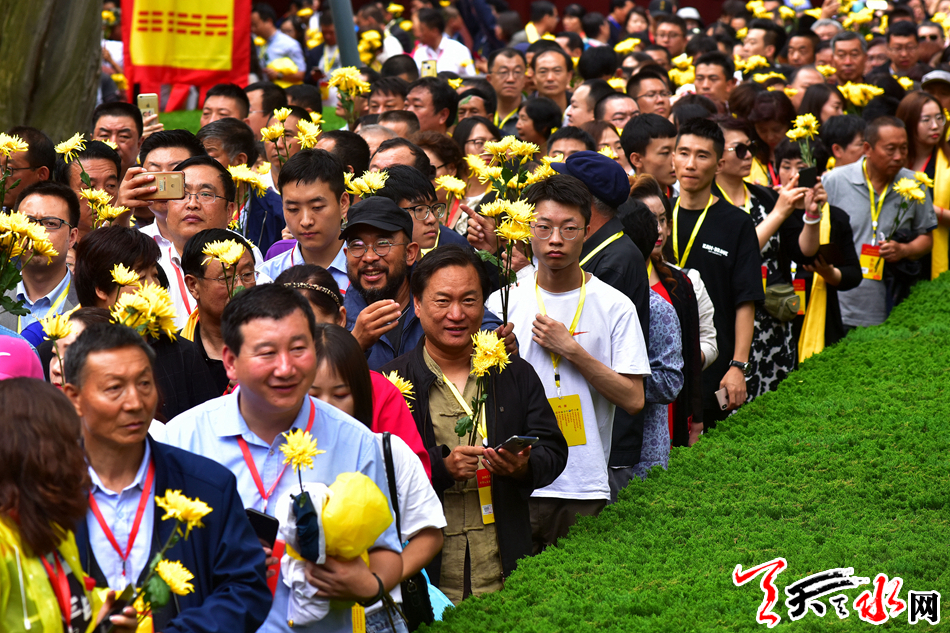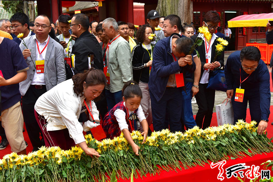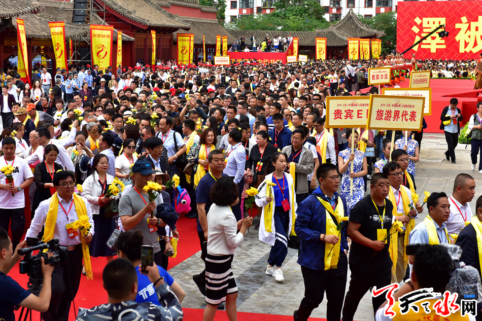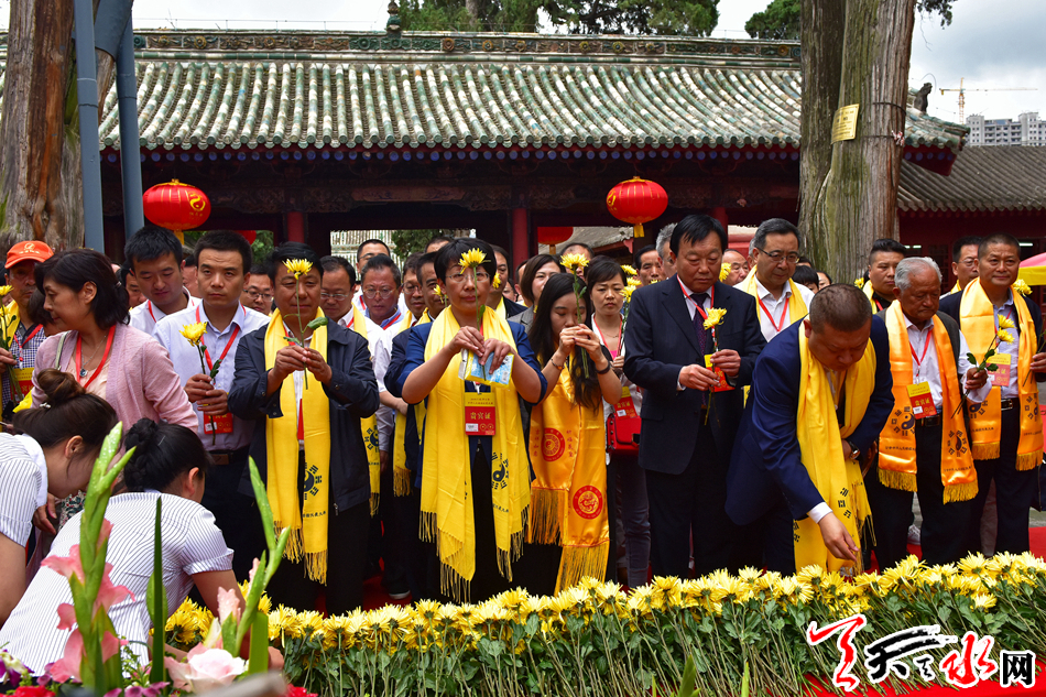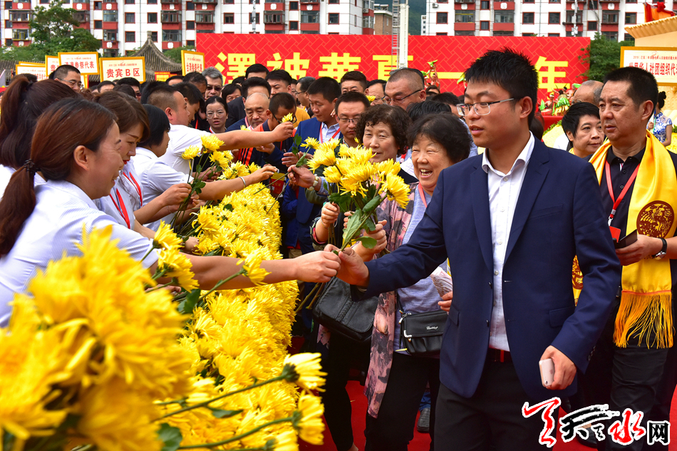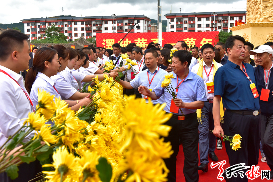 6月22日,2019(己亥)年公祭中华人文始祖伏羲大典后,现场市民和来宾纷纷领取鲜花,走进伏羲庙敬献鲜花拜谒伏羲圣像,表达对人文始祖伏羲的崇敬和景仰之情。