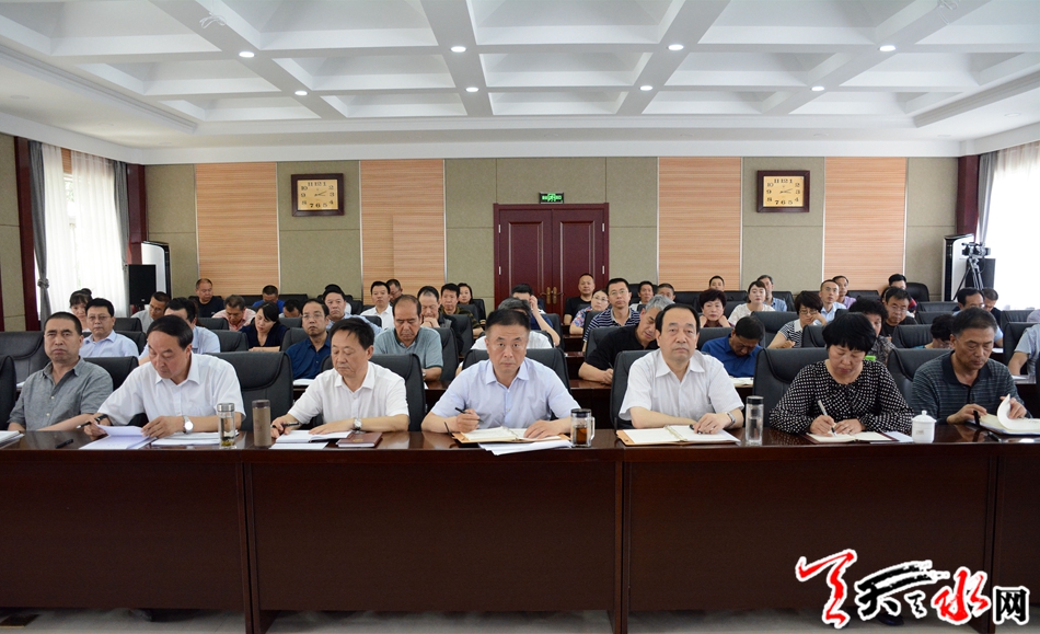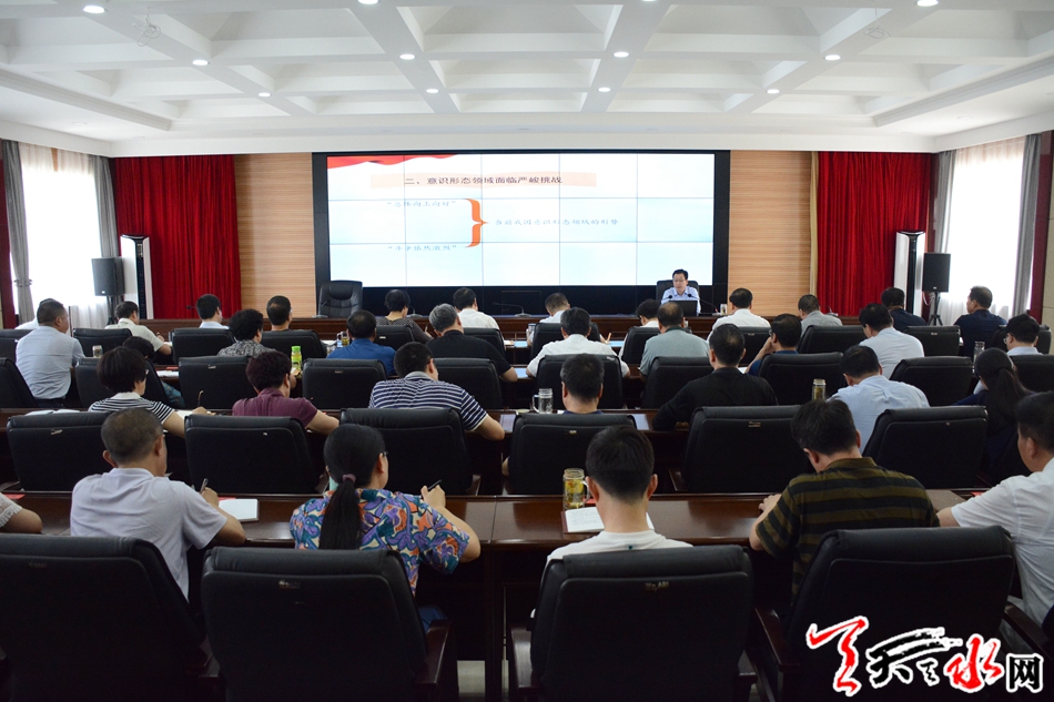 天天天水网讯【全媒体记者马放】6月25日,为了深入学习宣传贯彻落实习近平新时代中国特色社会主义思想和党的十九大精神、2019年全国“两会”精神,根据市委宣传部的部署要求,市人大常委会机关举行“百人百课百讲”宣讲活动,邀请市委讲师团团长郭黎平为机关干部职工作题为“努力提高党员干部意识形态能力”的宣讲报告。市人大常委会主任蒋晓强,副主任安志宏、宋建平、王晓琴,秘书长杨坤及全体干部职工聆听宣讲报告。