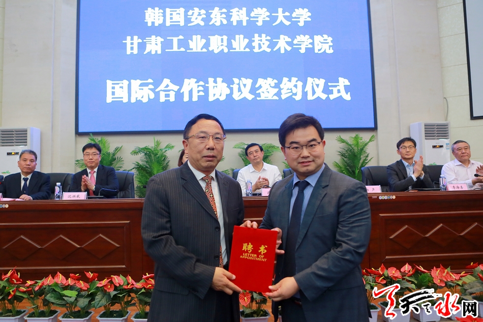 杨声为“海智计划”甘肃工业职业技术学院工作站客座教授韩国安东科学大学陈旭音颁发聘书。