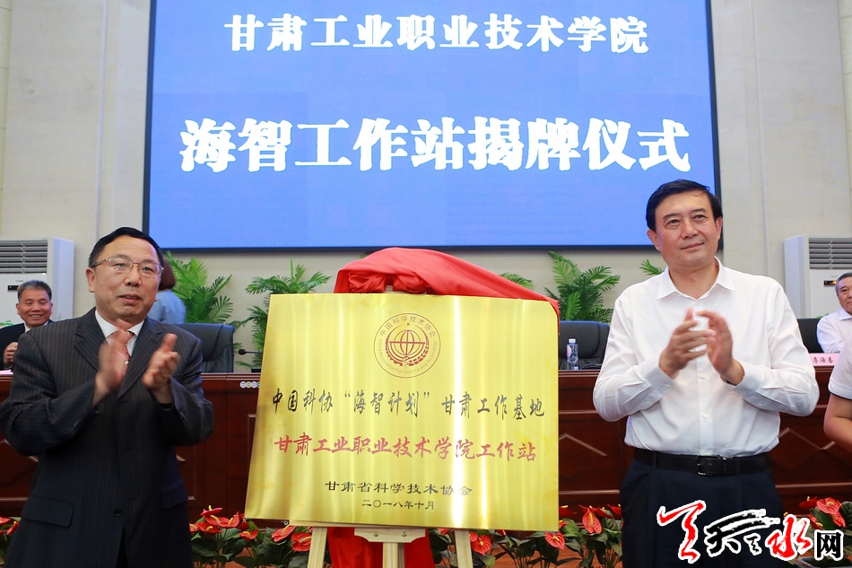 市委副书记赵卫东,甘肃工业职业技术学院党委书记杨声为“海智计划”甘肃工业职业技术学院工作站揭牌。