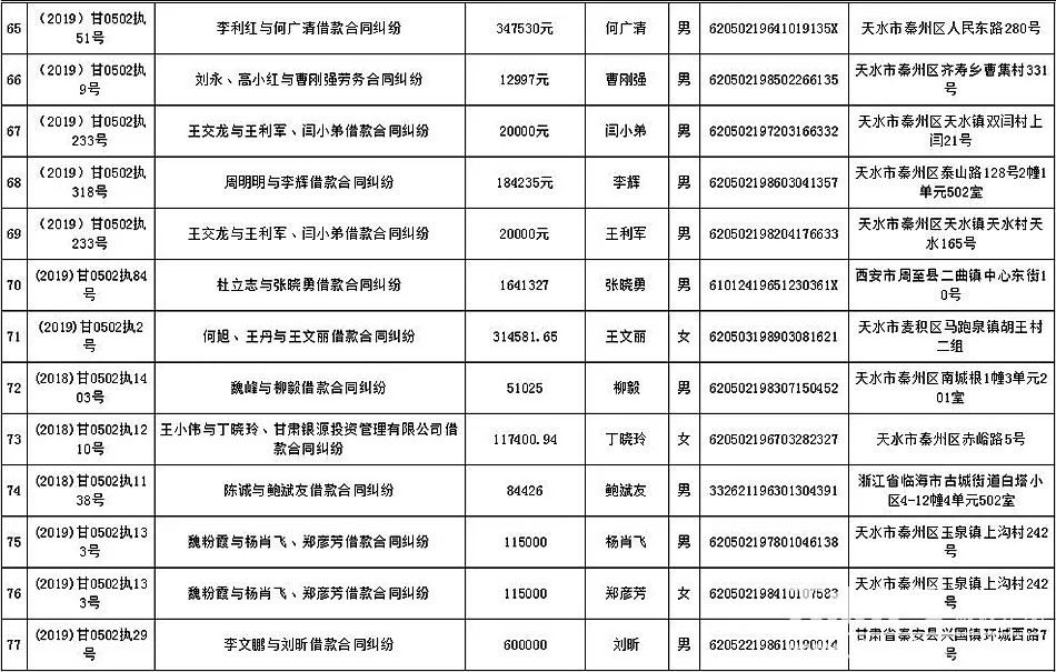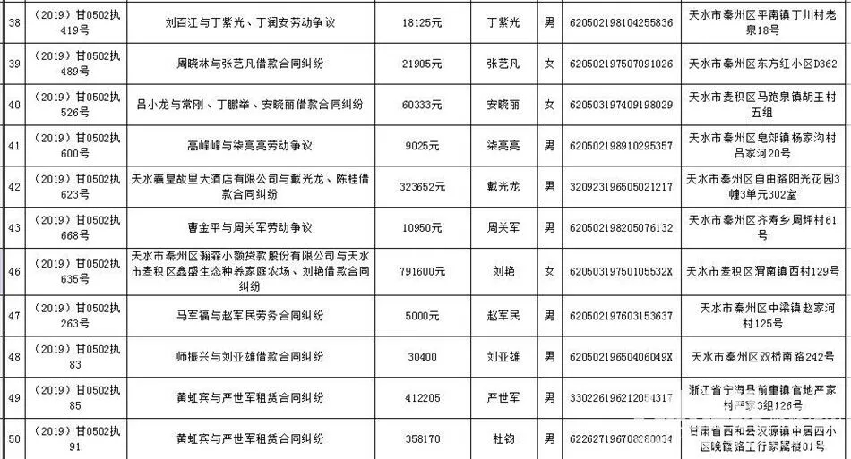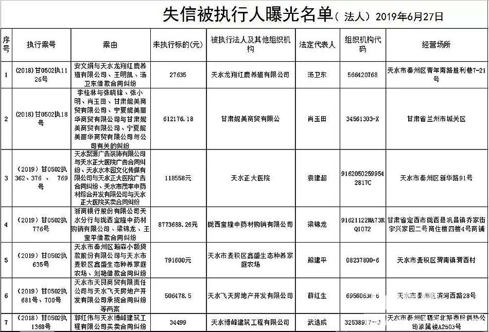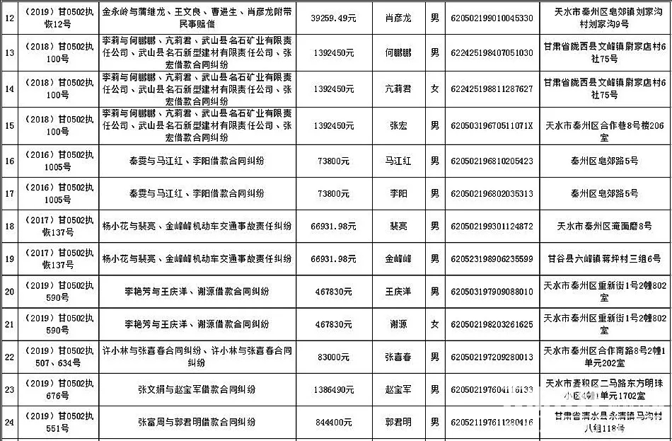 天天天水网讯 为进一步制裁规避执行行为,保障胜诉当事人的合法权益,推进社会诚信体系建设,依照《中华人民共和国民事诉讼法》、《最高人民法院关于公布失信被执行人名单信息的若干规定》等法律、司法解释的有关规定,现对一批已进入执行程序,且尚未全部履行义务的被执行人进行媒体曝光,并敦促所有被执行人自觉履行生效法律文书确定的义务,通告如下: