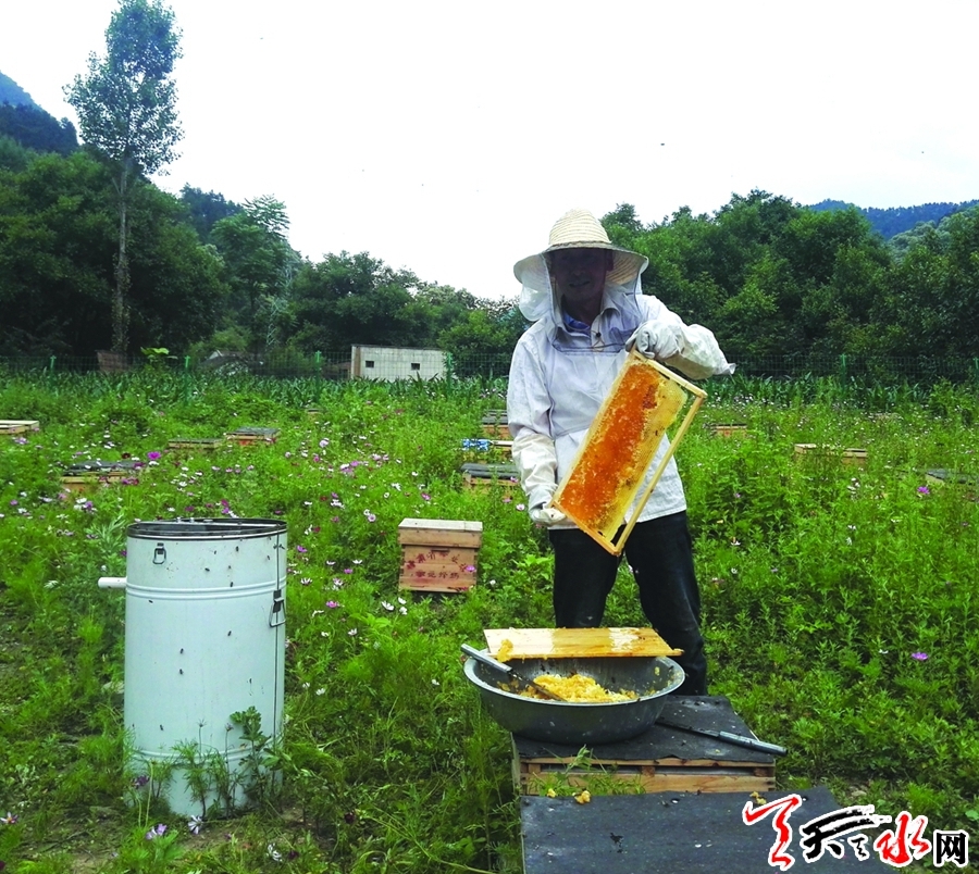 雷全君介绍说,2017年东西部协作工作开展以来,在天津市西青区的大力帮扶支持下,依托资源优势,因地制宜,精准对接,桃花坪村全面启动了脱贫奔小康中蜂产业园建设项目。截至目前,累计投入西青区帮扶资金613万元,发展中蜂养殖户2385户,养殖蜜蜂3万余群,其中贫困户1272户,养殖蜜蜂1.2万余群,建设养蜂实训基地8个,培训贫困户1063人,培育养蜂龙头企业2个,发展养蜂合作社32个。注册蜂产品商标6个,取得“无公害认证”蜂蜜2个,“麦积山花蜜”通过农业农村部地理标志认证,与天津华喜汇通供应链管理公司达成蜂蜜销售协议,带动贫困户户均增收6000元左右,拓宽了销售渠道,增加了群众收入,有效助推脱贫攻坚。