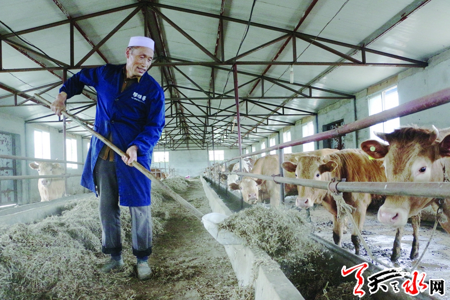 在张家川回族自治县,这里的回汉人民自古就有养牛、养羊和从事皮毛贩运、畜产品加工的传统习惯。近年来,张家川县紧紧依托扶贫政策和资源优势,制定出台了一系列畜牧业发展支持政策,许多养殖专业合作社应运而生。7月3日,记者走进上磨村养殖专业合作社,看见几间整齐的彩钢牛棚一字排开,成堆的草料整齐码放在棚内,圈内打扫得干干净净,一群大大小小的牛或怡然自得地咀嚼着草料,或懒洋洋地发呆,饲养员米世贵正在忙碌的给牲畜加草料。