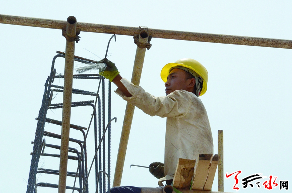 7月17日,记者来到藉河生态环境综合治理二期工程第四标段施工现场,看到施工人员正在进行橡胶坝的排水管安装工作,有的工人正在焊接、有的在做钢筋砼的铺盖,还有一些工人正在掩盖裸露在外的尘土,虽然烈日炎炎,工人们都在各自的岗位上忙碌不停。