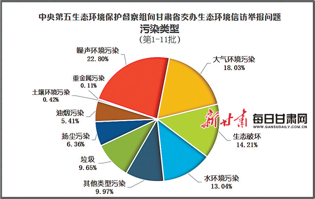 经统计,前十一批次转办的685件生态环境信访举报问题中,噪声环境污染类问题占比22.80%,大气环境污染类问题占比18.03%,生态破坏类问题占比14.21%,水环境污染类问题占比13.04%,垃圾类问题占比9.65%,扬尘污染类问题占比6.36%,油烟污染类问题占比5.41%,土壤环境污染类问题占比0.42%,重金属污染类问题占比0.11%,其他类型占比9.97%。
