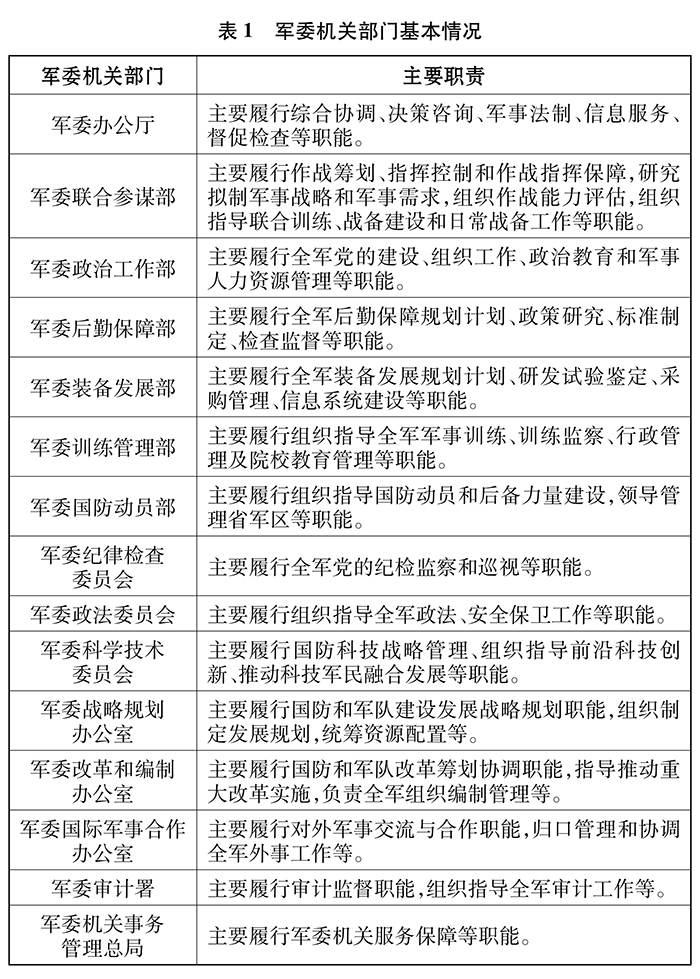 调整组建新的军委机关部门。优化军委机关职能配置和机构设置,由过去的总参谋部、总政治部、总后勤部、总装备部四总部调整为军委机关15个职能部门,作为军委集中领导的参谋机关、执行机关、服务机关。指挥、建设、管理、监督等路径更加清晰,决策、规划、执行、评估等职能配置更加合理。