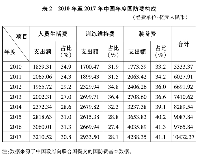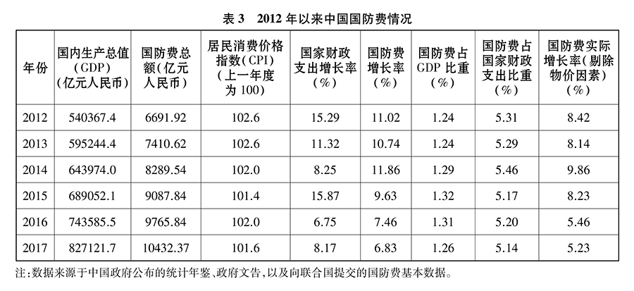2012年至2017年,中国国防费从6691.92亿元人民币增加到10432.37亿元人民币。中国国内生产总值(GDP)按当年价格计算年平均增长9.04%,国家财政支出年平均增长10.43%,国防费年平均增长9.42%,国防费占国内生产总值平均比重为1.28%,占国家财政支出平均比重为5.26%。国防费占国内生产总值的比重稳定,与国家财政支出保持同步协调增长。
