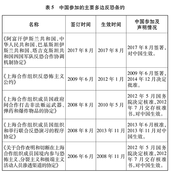 中国积极开展国际和地区反恐合作。加强上海合作组织框架内的国际反恐合作,组织开展反恐联合演习,打击非法贩运武器、弹药和爆炸物品,合作查明和切断人员渗透渠道,推动国际反恐情报交流共享。主办以反恐为主题的“长城”国际论坛,积极参与亚太经合组织反恐工作组、全球反恐论坛等多边反恐机制。同有关国家举行双边反恐磋商。推动创建阿富汗、中国、巴基斯坦、塔吉克斯坦四国军队反恐合作协调机制,举行两届军队高级领导人会议,开展反恐交流合作,积极维护地区安全。