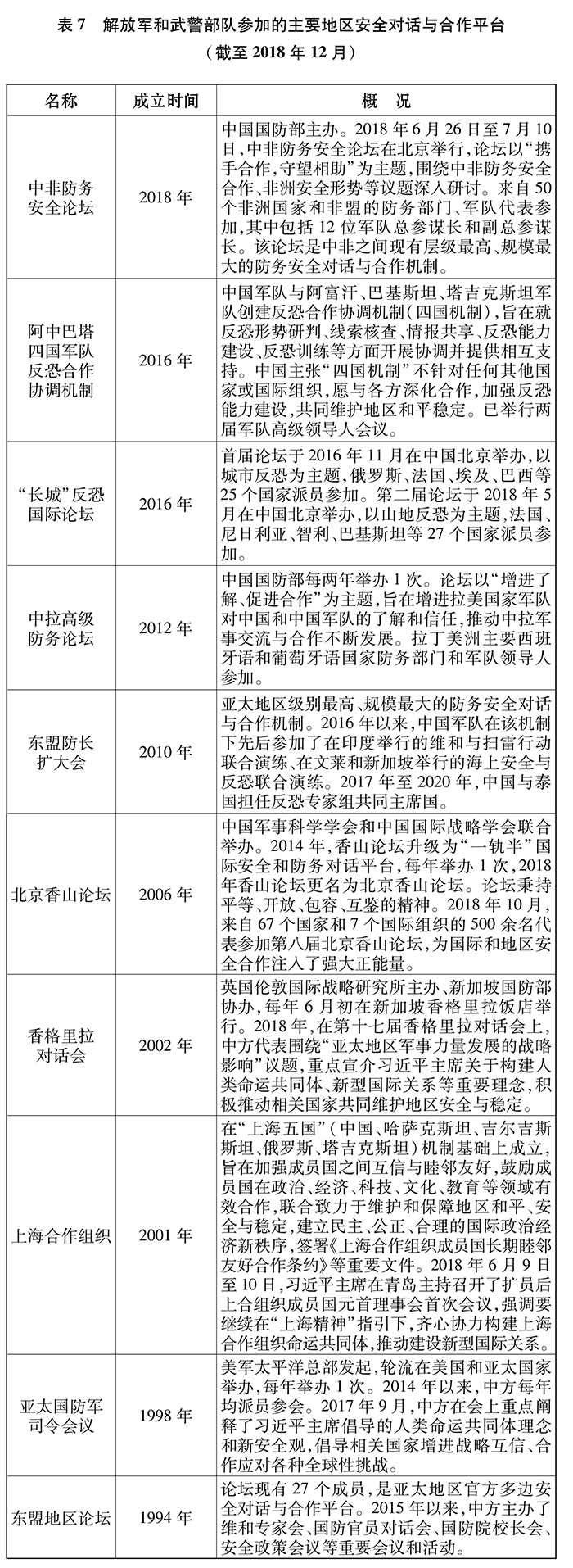 中国军队坚持互信互惠、合作共赢的原则,同世界各国军队开展务实交流合作。2012年以来,中国同30多个国家举行百余次联合演习与训练,演练内容从非传统安全领域发展到传统安全领域,演练地域从中国周边延伸至远海,参演力量从以陆军为主拓展至陆海空多军兵种。中国军队积极组织人才培养交流合作,2012年以来,向50多个国家派出军事留学生1700余名,20余所军队院校分别同40多个国家的院校建立和保持了校际交流关系,共接纳130多个国家的上万名军事人员到中国军队院校学习。
