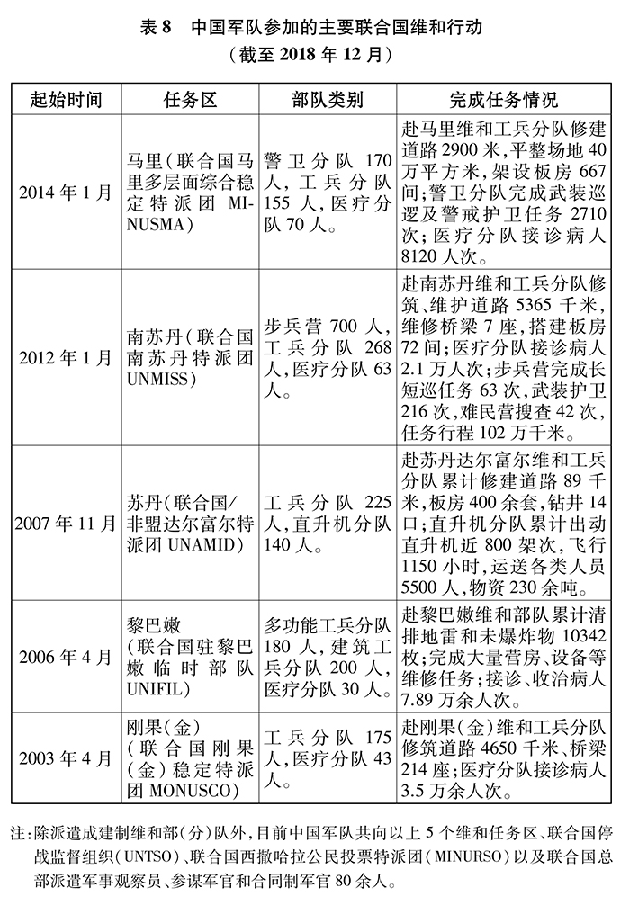 中国积极支持联合国维和行动,是联合国维和行动的主要出资国之一,是安理会常任理事国中第一大出兵国。截至2018年12月,中国军队已累计参加24项联合国维和行动,派出维和军事人员3.9万余人次,13名中国军人牺牲在维和一线。中国军队在维和任务区新建、修复道路1.3万余千米,排除地雷及各类未爆物10342枚;运送物资135万余吨,运输总里程1300万余千米;接诊病人17万余人次;完成武装护卫、长短途巡逻等任务300余次。
