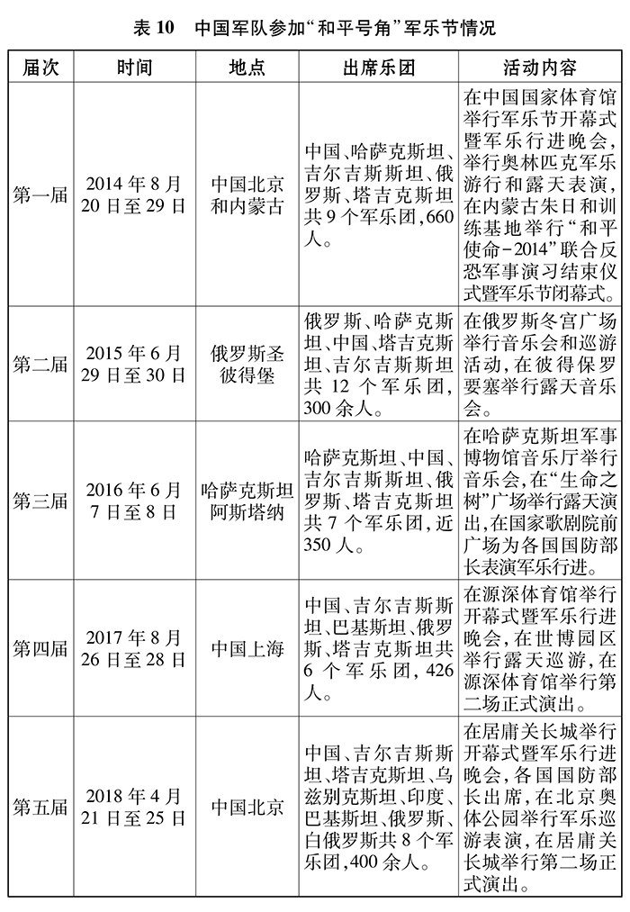 2001年6月,中国同哈萨克斯坦、吉尔吉斯斯坦、俄罗斯、塔吉克斯坦、乌兹别克斯坦共同发起成立上海合作组织。上海合作组织已成为世界上幅员最广、人口最多的综合性新型区域合作组织,形成互信、互利、平等、协商、尊重多样文明、谋求共同发展的“上海精神”,推动构建上海合作组织命运共同体,推动建设新型国际关系,为地区和平与发展作出了新贡献。2017年6月,上海合作组织首次扩员,印度和巴基斯坦成为上海合作组织成员国。2018年4月,举行上海合作组织扩员后首次国防部长会议。上海合作组织成员国持续加强防务安全领域交流合作,举行“和平使命”系列演习,举办“和平号角”军乐节,深化睦邻友好和战略互信,加强军事文化交流,增进成员国团结友谊。