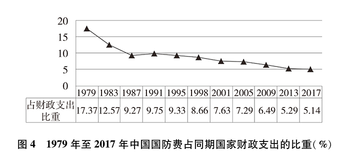 改革开放以来,中国国防开支经历了从维持性投入到适度增长的发展历程,总体保持与国家经济和财政支出同步适度协调增长。国防费占国内生产总值(GDP)比重从1979年最高的5.43%下降到2017年的1.26%,近30年一直保持在2%以内。1979年国防费占国家财政支出比重为17.37%,2017年为5.14%,下降超过12个百分点,总体下降趋势明显。