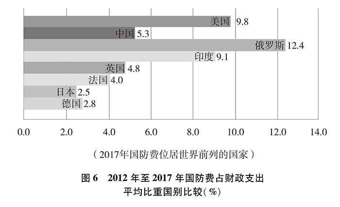 从国防费占国内生产总值比重看,2012年至2017年,中国国防费占国内生产总值平均比重约为1.3%,美国约为3.5%、俄罗斯约为4.4%、印度约为2.5%、英国约为2.0%、法国约为2.3%、日本约为1.0%、德国约为1.2%。中国国防费占国内生产总值的平均比重在国防费位居世界前列的国家中排在第六位,是联合国安理会常任理事国中最低的。
