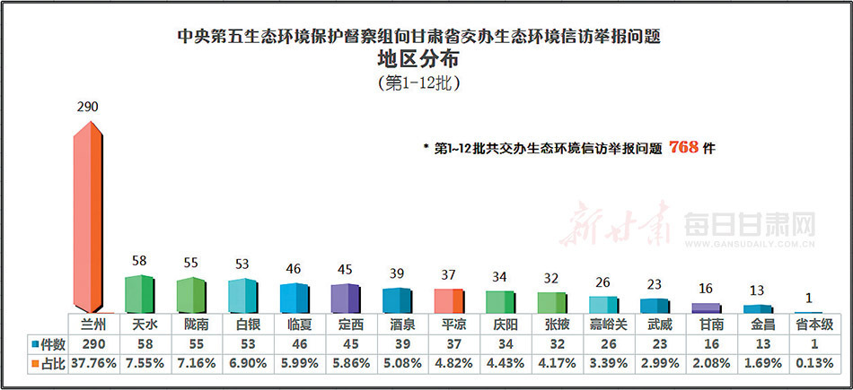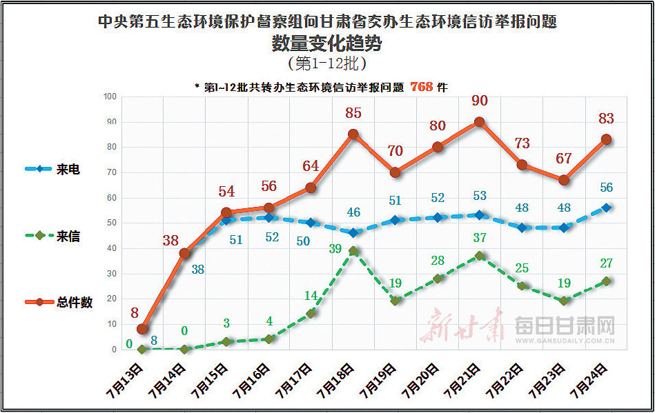 每日甘肃网兰州讯(新甘肃·甘肃日报记者文洁)7月24日,中央第五生态环境保护督察组向甘肃省移交了第十二批生态环境信访举报问题共83件,其中来电56件,来信27件,涉及我省13个市(州)和1个省级部门。