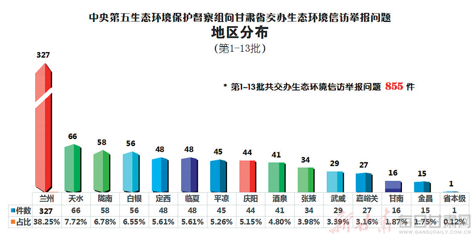 每日甘肃网兰州讯(新甘肃·甘肃日报记者文洁)7月25日,中央第五生态环境保护督察组向甘肃省移交了第十三批生态环境信访举报问题共87件,其中来电51件,来信36件,涉及我省13个市(州)。