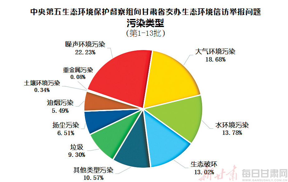 经统计,前十三批次转办的855件生态环境信访举报问题中,噪声环境污染类问题占比22.23%,大气环境污染类问题占比18.68%,水环境污染类问题占比13.78%,生态破坏类问题占比13.02%,垃圾类问题占比9.30%,扬尘污染类问题占比6.51%,油烟污染类问题占比5.49%,土壤环境污染类问题占比0.34%,重金属污染类问题占比0.08%,其他类型占比10.57%。