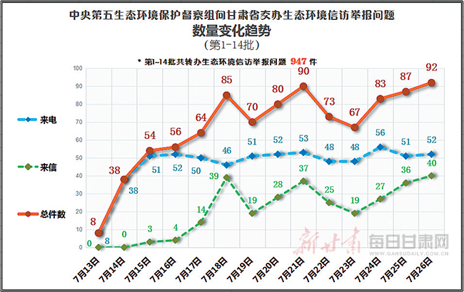 每日甘肃网兰州讯(新甘肃·甘肃日报记者文洁)7月26日,中央第五生态环境保护督察组向甘肃省移交了第十四批生态环境信访举报问题共92件,其中来电52件,来信40件,涉及我省14个市(州)。