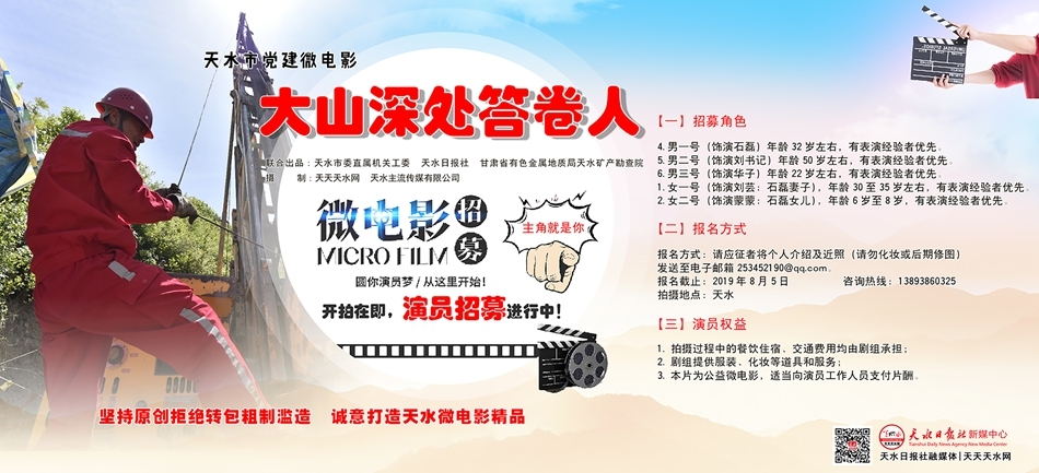 有一群这样的人,他们风餐露宿,勘探是他们写在大山深处的价值。有一群这样的人,他们披星戴月,坚守是他们献身地质事业的信念。天水市党建微电影《大山深处答卷人》(暂定名)会告诉你有这样一群常年扎根地质一线的共产党员知识分子,奋战野外、献身地质事业的感人事迹,折射出基层党员知识分子永远不忘初心,努力为国家的地质事业无私奉献的精神。