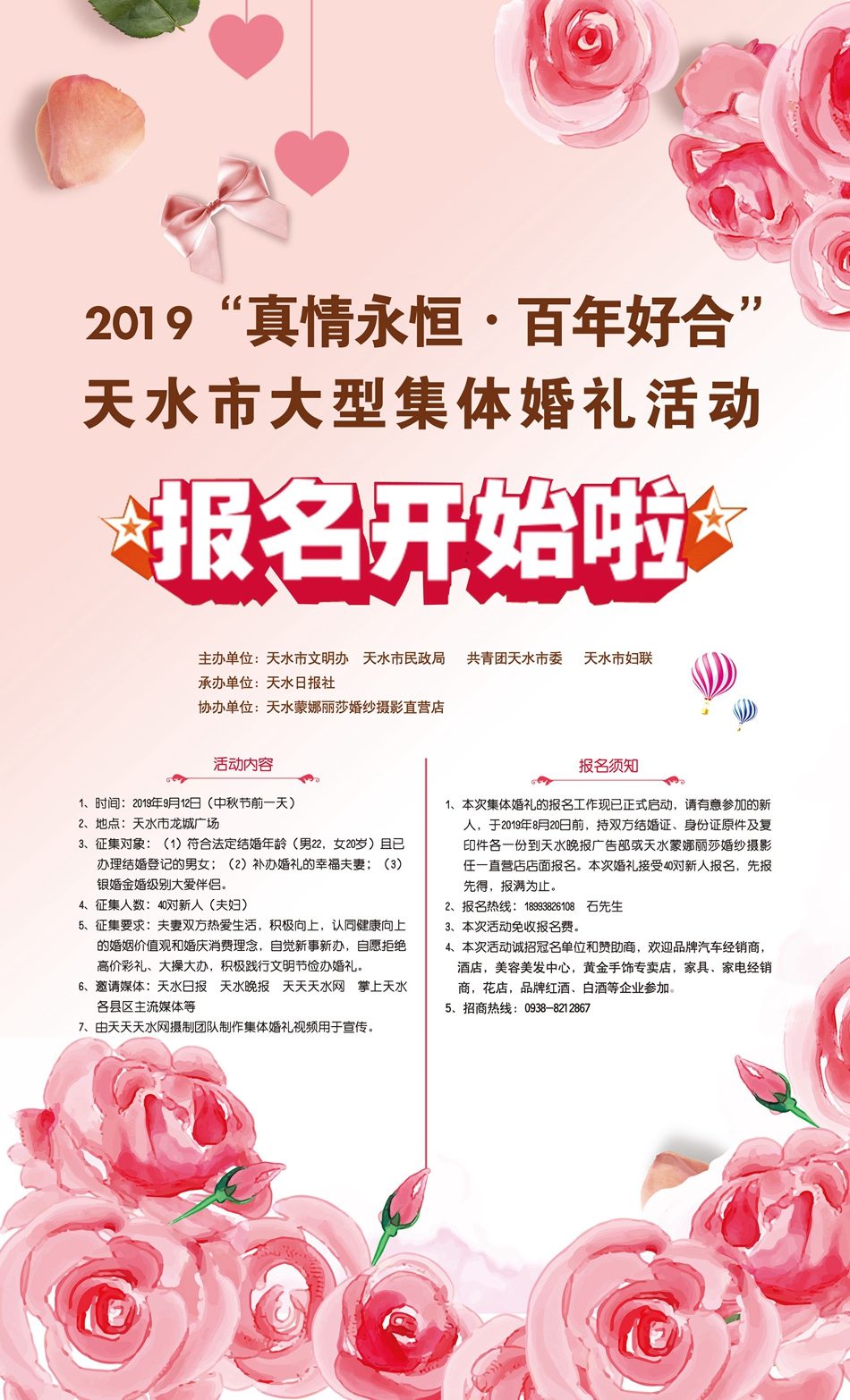 1、本次集体婚礼的报名工作现已正式启动,请有意参加的新人,于2019年8月20日前,持双方结婚证、身份证原件及复印件各一份到天水晚报广告部或天水蒙娜丽莎婚纱摄影任一直营店店面报名。本次婚礼接受40对新人报名,先报先得,报满为止。