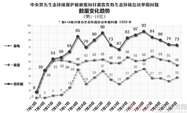 每日甘肃网兰州讯(新甘肃·甘肃日报记者文洁)7月30日,中央第五生态环境保护督察组向甘肃省移交了第十八批生态环境信访举报问题共73件,其中来电45件,来信28件,涉及我省13个市(州)。
