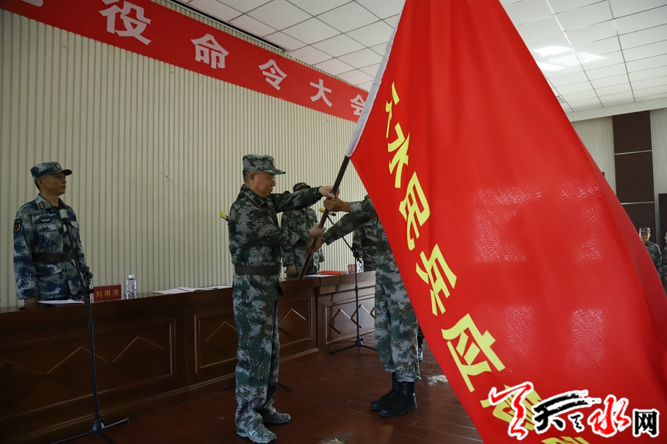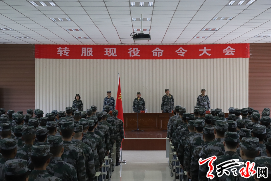 在转服现役命令大会上,市委书记、军分区党委第一书记王锐同志为组建的天水市民兵应急营授旗并讲话,市委副书记赵卫东同志宣读了转服现役命令,市委常委、天水军分区司令员刘甫清宣读了授衔命令,副市长王燕出席会议。王锐代表市委、市政府对市民兵应急营的组建和转服现役的人员表示热烈祝贺!向驻军部队全体官兵、广大民兵预备役人员致以节日的问候!向全市军队离退休干部、转业退伍军人、伤残军人和军烈属表示诚挚的慰问。