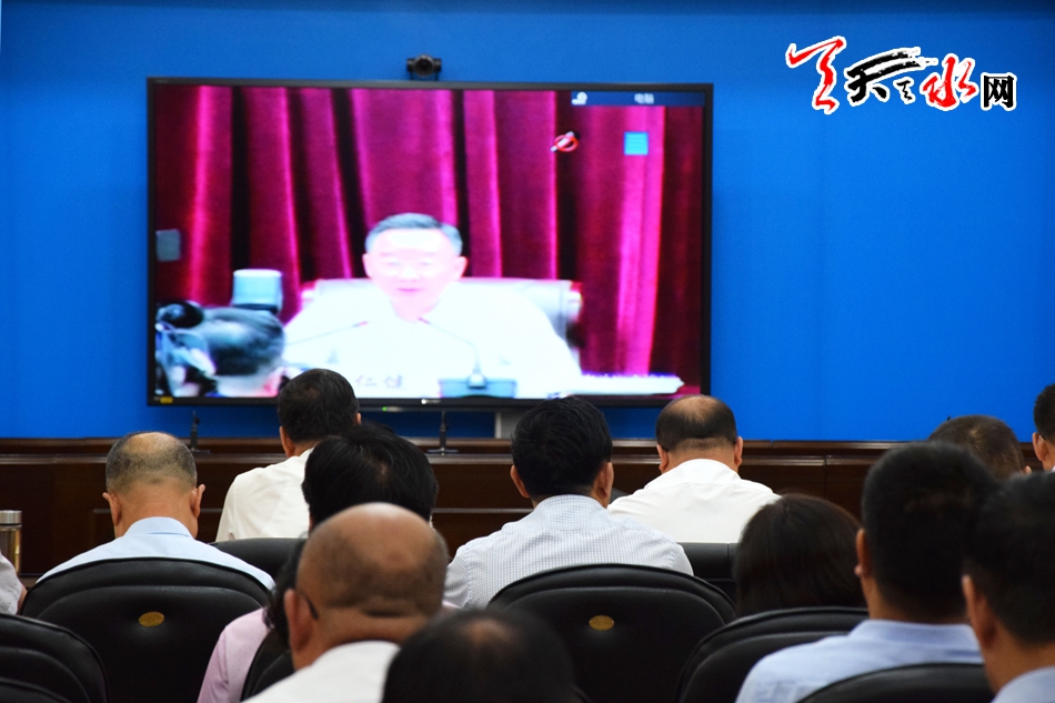 天水市领导王军、宫辉、王洪义、马瑛、董小平,市长助理李敬峰在天水分会场收听收看电视电话会。