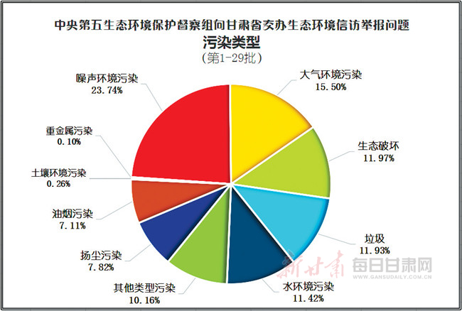 经统计,前二十九批次转办的2339件生态环境信访举报问题中,噪声环境污染类问题占比23.74%,大气环境污染类问题占比15.50%,生态破坏类问题占比11.97%,垃圾类问题占比11.93%,水环境污染类问题占比11.42%,扬尘污染类问题占比7.82%,油烟污染类问题占比7.11%,土壤环境污染类问题占比0.26%,重金属污染类问题占比0.10%,其他类型占比10.16%。