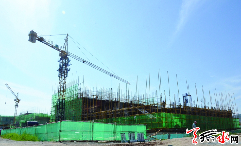 驱车走在天水经济技术开发区润天东路,道路一侧是甘肃海林中科科技股份有限公司搬迁改造产业技术升级项目施工现场,绿色围栏包围下的施工现场不断传出机器的轰鸣声,高悬于空中挥舞着巨臂的一排大型塔吊下,是拔地而起的幢幢高楼和进进出出的施工车辆。