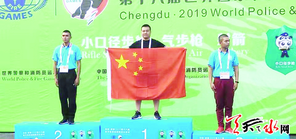 天天天水网讯【记者蔚军平】8月12日,从第18届世界警察和消防员运动会上传来喜讯,代表中国警察参加此次运动会的天水市公安局民警周龙飞夺得50米小口径步枪三姿(跪射、卧射、立射)金牌,为家乡人民争了光,为祖国赢得了荣誉。