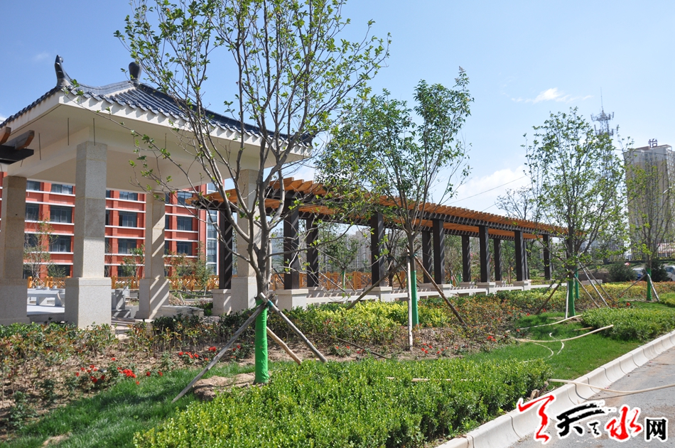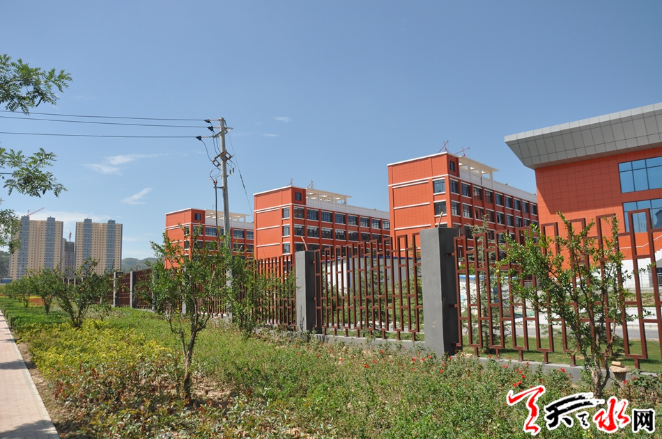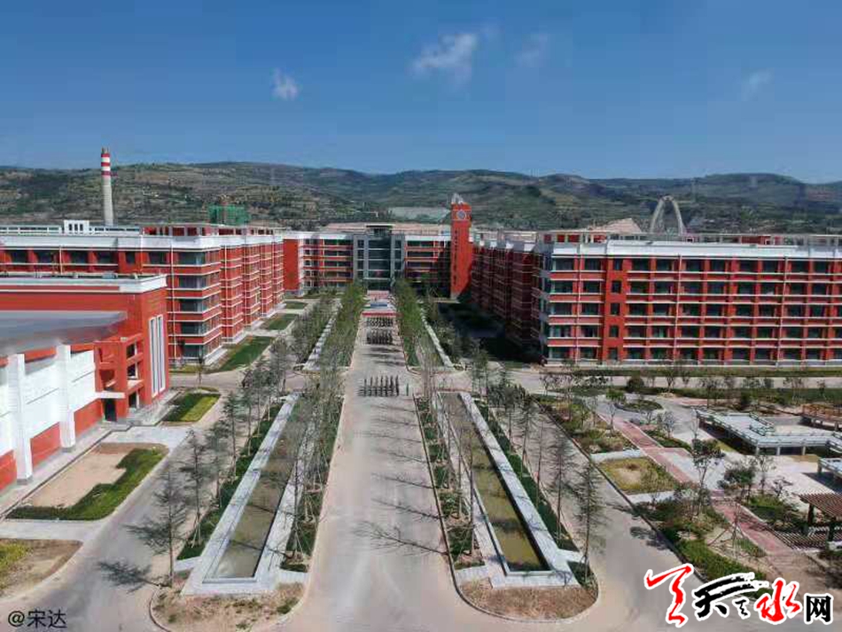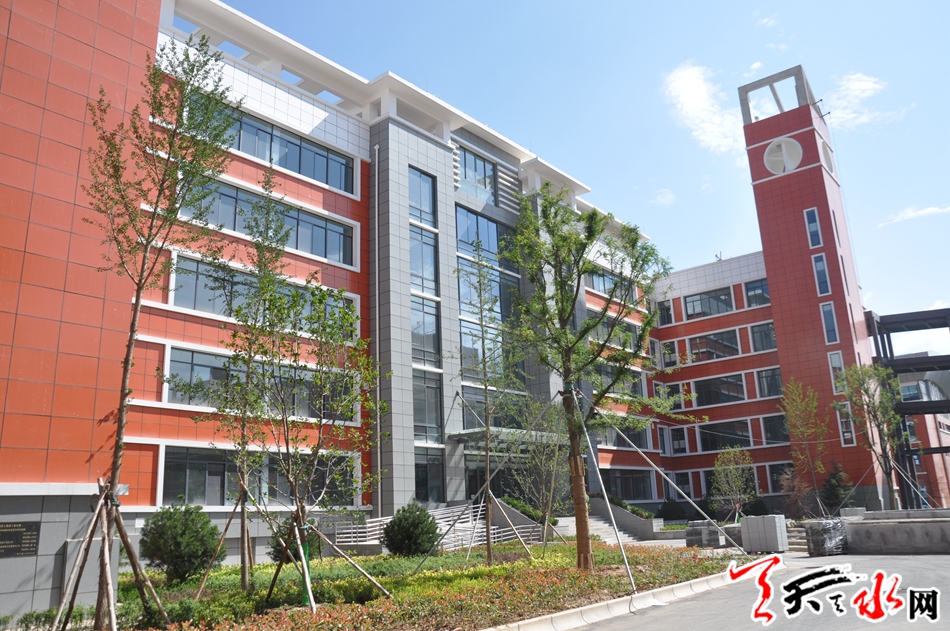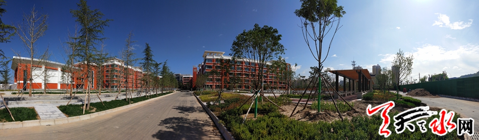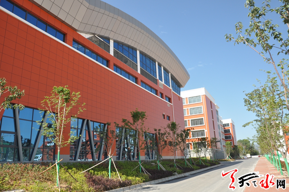 天水市三中异地搬迁项目暨天水市三中平峪校区内道路很宽阔,往来方便,新栽植的各种花卉、树木长势喜人。学校主校门是南门,侧门是东门,由于南门还没有建设好,现在只有东门投入使用。