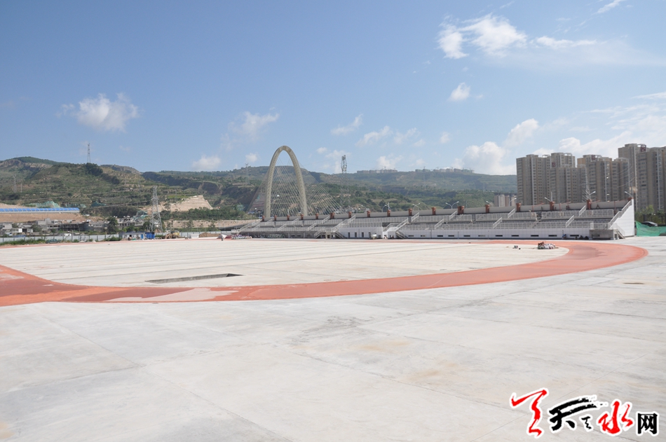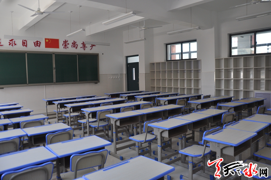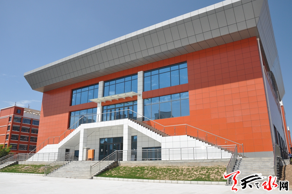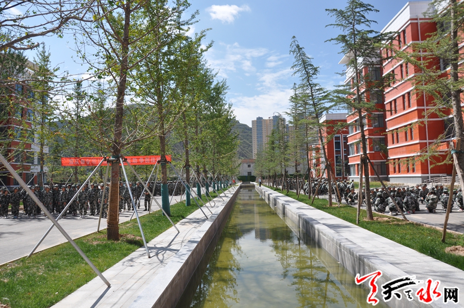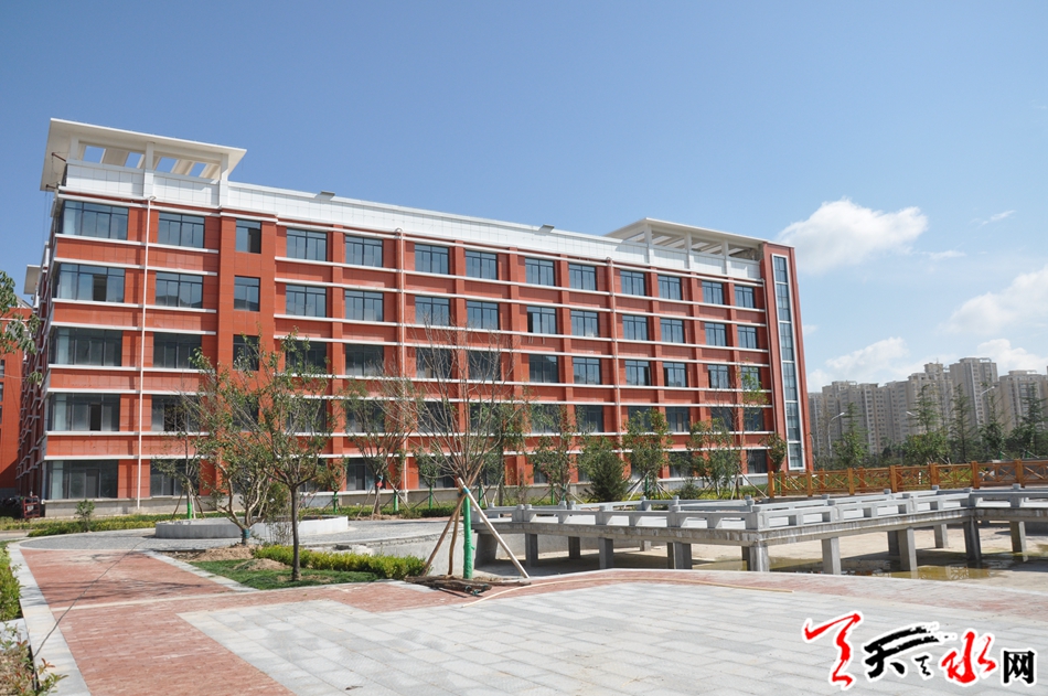 天水市三中异地搬迁项目暨天水市三中平峪校区内道路很宽阔,往来方便,新栽植的各种花卉、树木长势喜人。学校主校门是南门,侧门是东门,由于南门还没有建设好,现在只有东门投入使用。