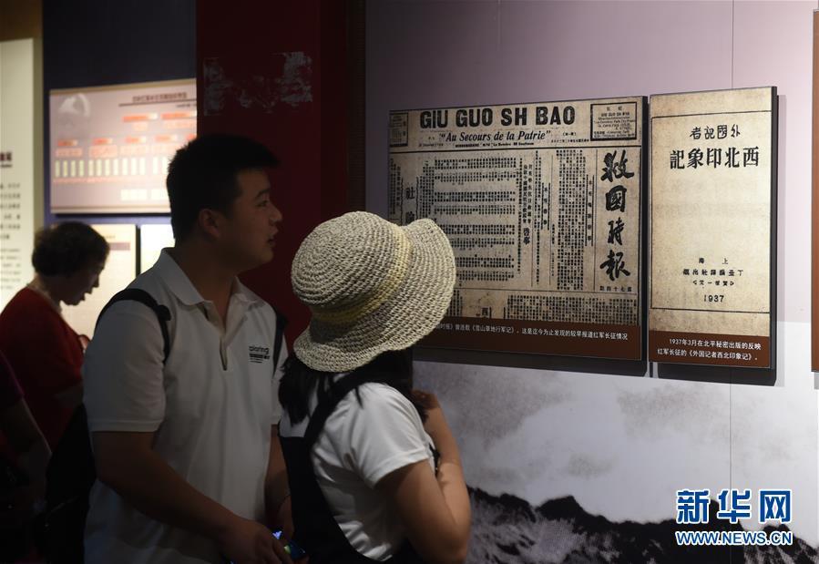 8月16日,在红军长征哈达铺纪念馆展厅内,观众参观展出的较早报道红军长征情况的报纸《救国时报》。新华社记者 罗晓光 摄