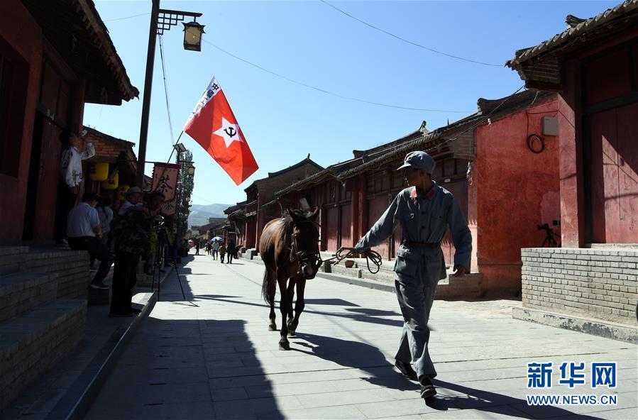8月16日,一名身穿红军服的少年牵马走在哈达铺镇红军街上。当地群众经常为游客表演再现红军经过哈达铺场景的节目。 新华社记者 马宁 摄