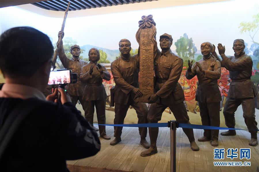 8月16日,在红军长征哈达铺纪念馆展厅内,观众参观拍摄复原当年哈达铺苏维埃政府成立场面的雕塑。新华社记者 罗晓光 摄