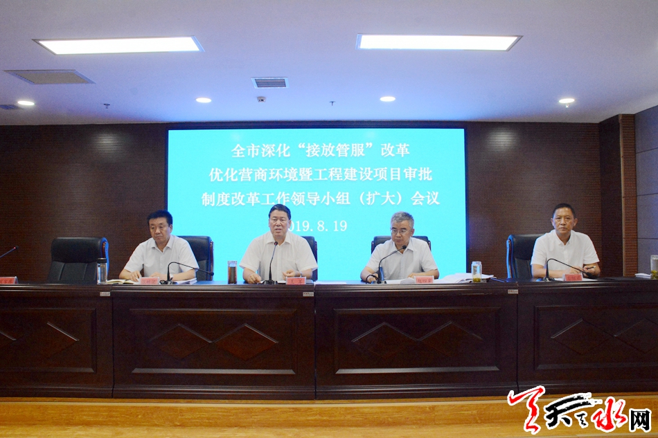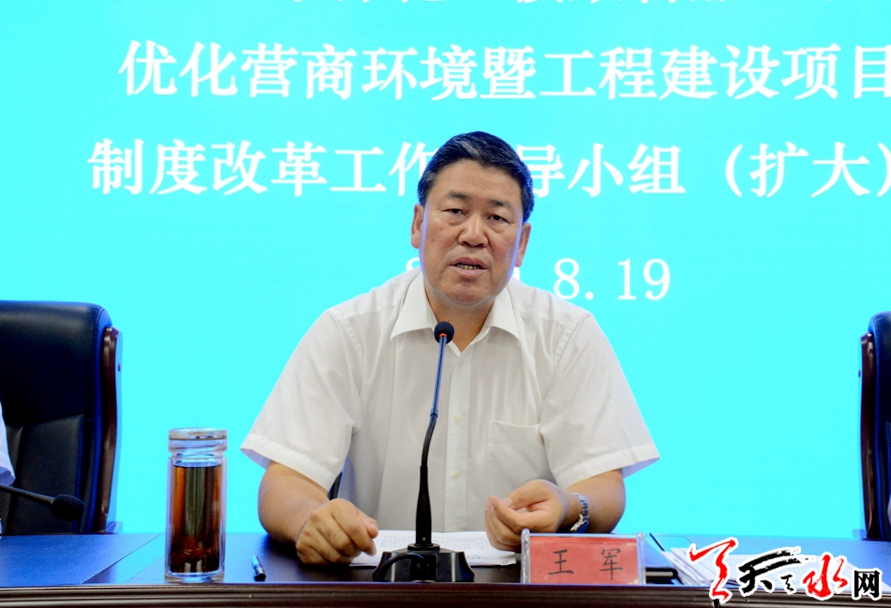 天天天水网讯【全媒体记者 冯丽娟】8月19日,全市深化“接放管服”改革优化营商环境暨工程建设项目审批制度改革工作领导小组(扩大)会议召开。市委副书记、市长王军强调,要按照中央和省、市的部署要求,推动全市营商环境持续改善,以实际行动扶持企业做大做强,让群众办事更放心更舒心。